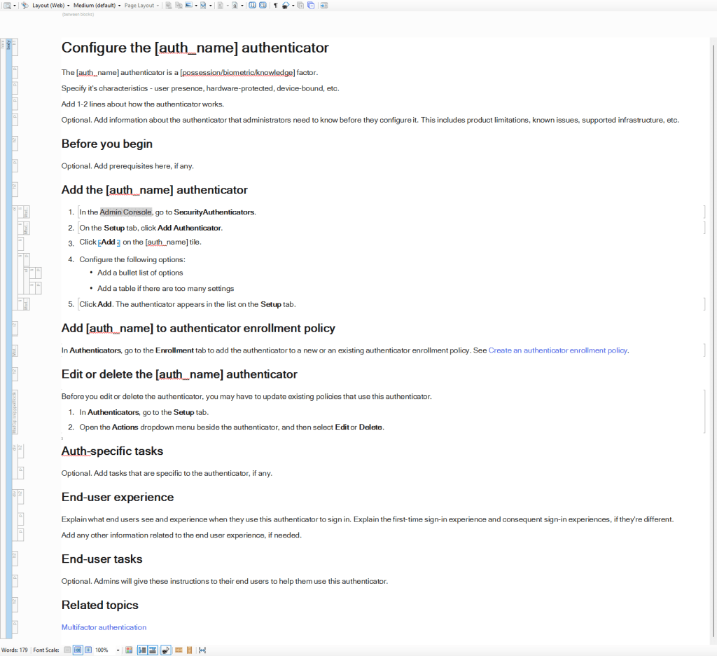 Once the template was approved, we rewrote the authenticator topics to follow the new content model. The original topics were already published on the website, so I worked in GitHub branches to make my changes. The writing process involved writing the draft, getting it reviewed and approved by the SMEs, getting it approved by the editor, and publishing.