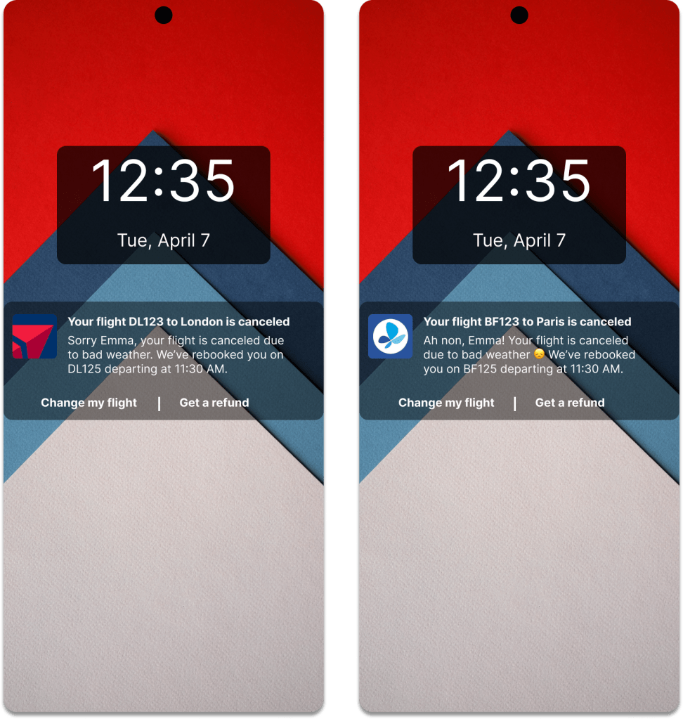 For French Bee, however, I reworked the message to bring the airline’s personality in it by adding a little French. Since its flyers are mainly young and traveling for a vacation, I’ve used an exclamation mark and an emoji to bring a conversational friendly tone to the message.