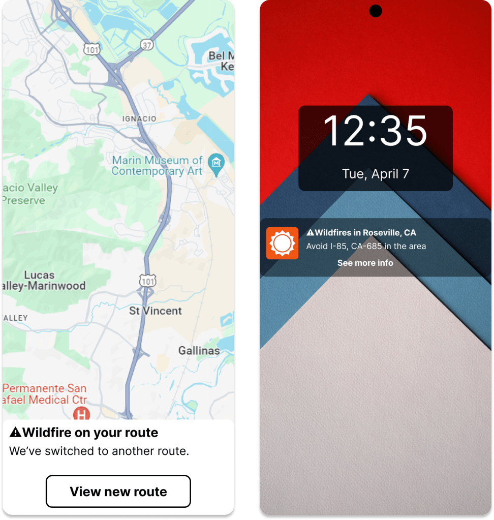 How would you let the user know there’s a fire happening in a nearby town that is causing road closures? The effect on their commute is unknown, but there is a definite danger if the fire gets closer. How do you communicate this to them? When? Write it.