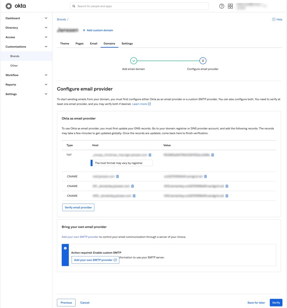 To start sending emails from your domain, you must first configure either Okta as an email provider or a custom SMTP provider. You can also configure both. You need to verify at least one email provider, and you may verify both if desired.